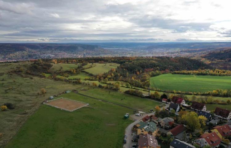 Landschaftlich schön gelegen am oberen Rand von Cospeda, mit Blick auf grüne Wiesen, Felder und Wälder, ist der Reiterhof von Jena in ca. 10 und von Weimar in ca. 20 Minuten zu erreichen.